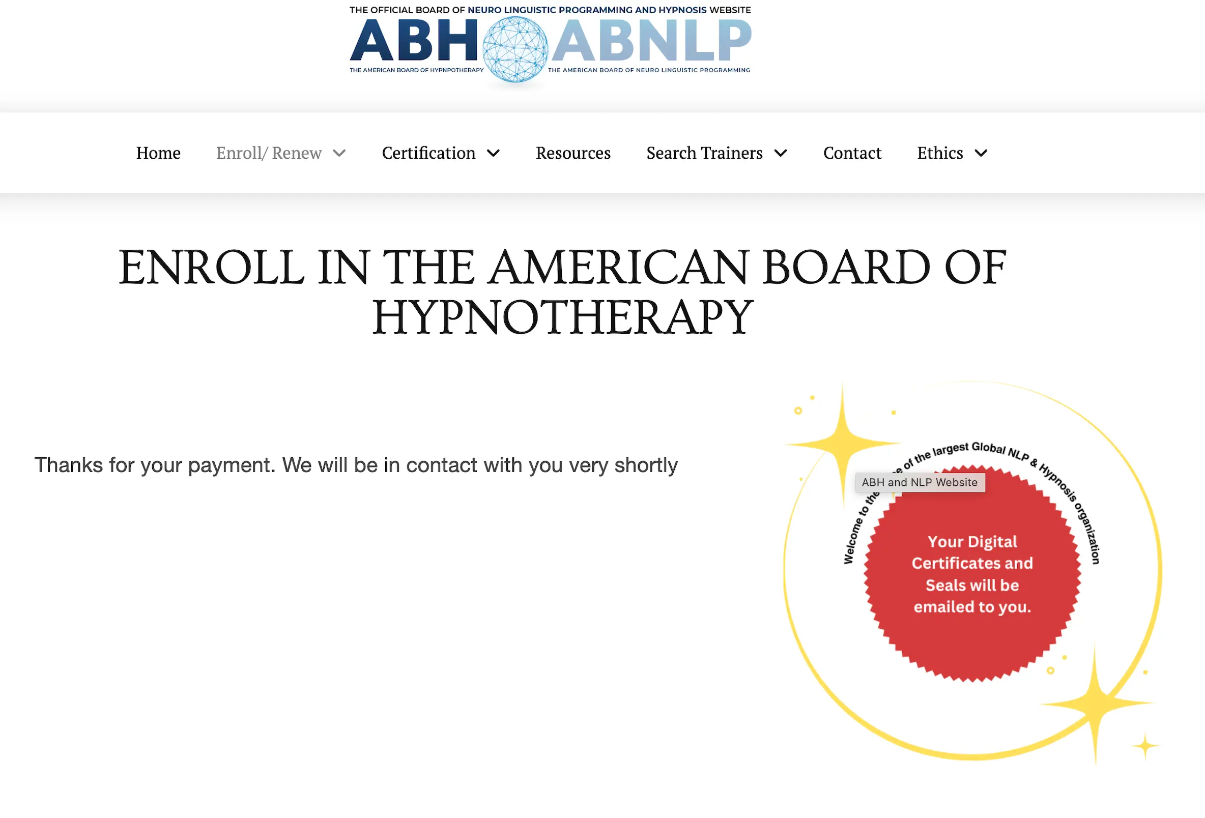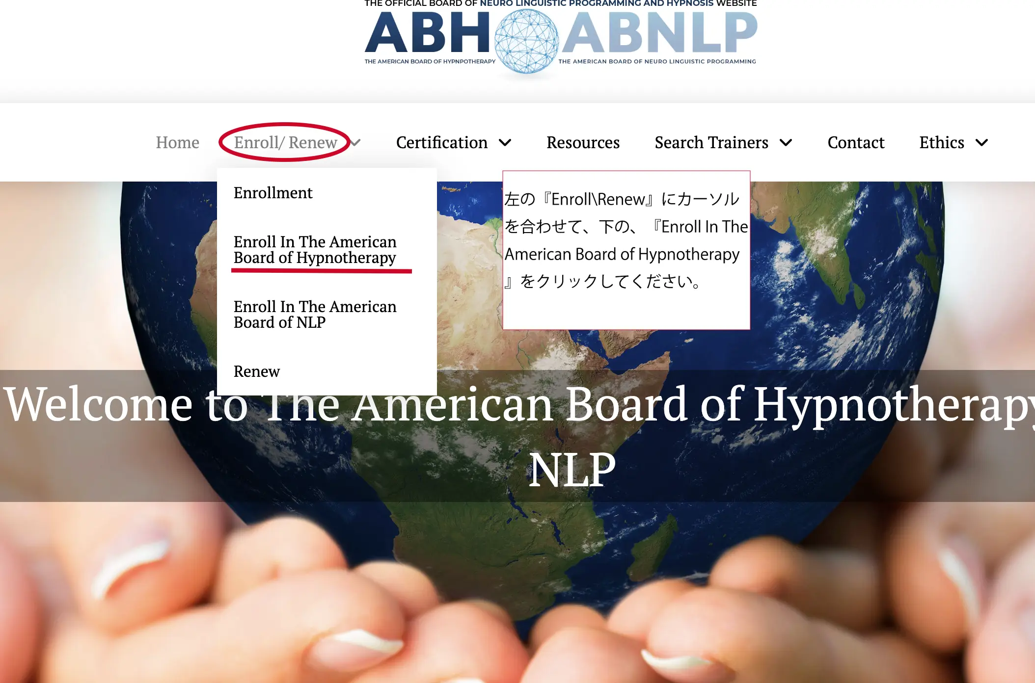 トップのメニューの『Enroll/Renew』から、『Enroll In The American Board of Hypnotherapy』を選んでクリックしてください。