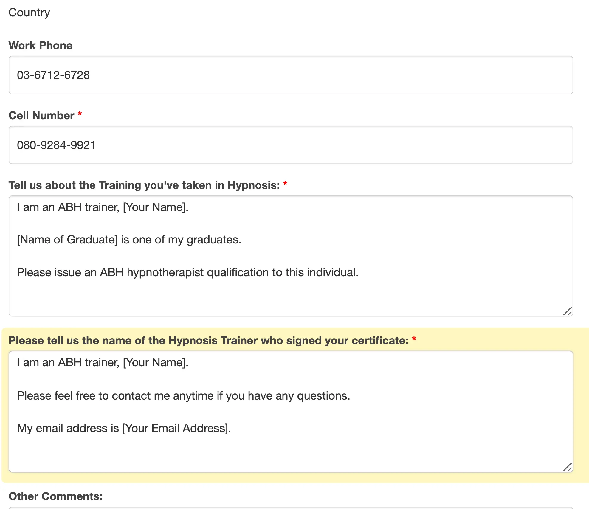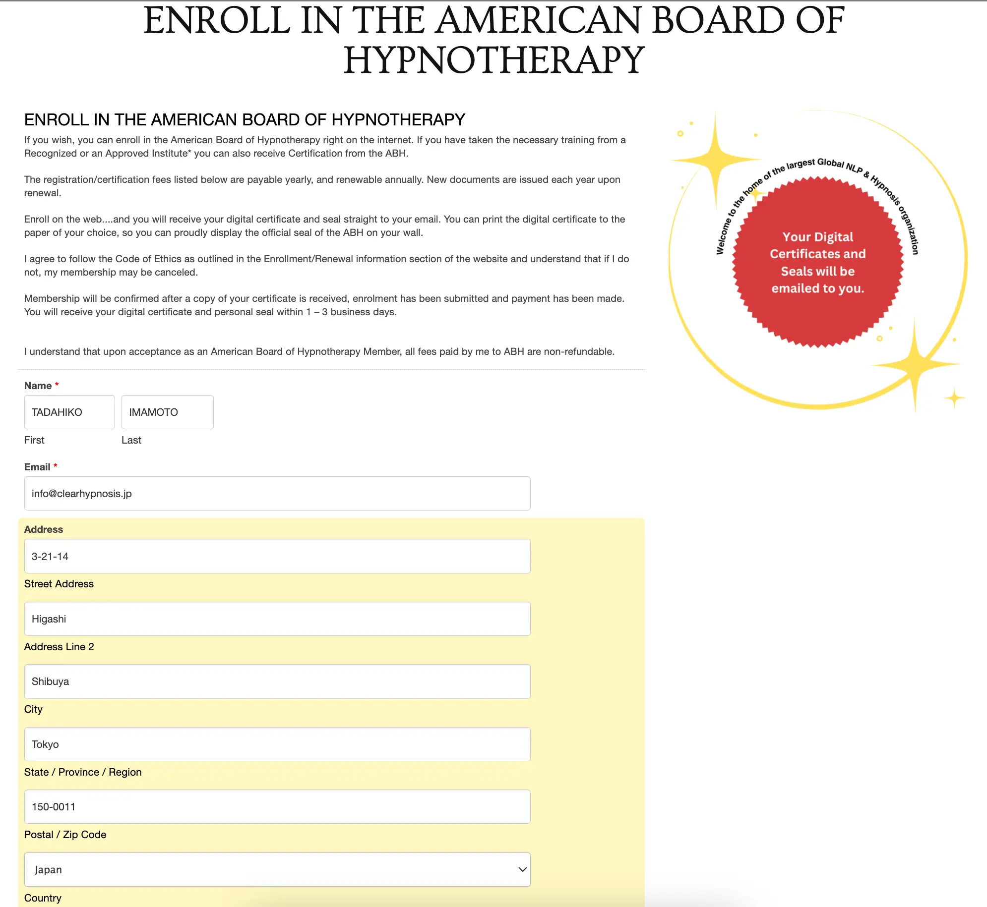 (上の文の日本語訳は、私はABHトレーナーの〇〇です。口口は私の卒業生です。ABHヒプノセラピストの資格を発行してください。)という意味になります。
