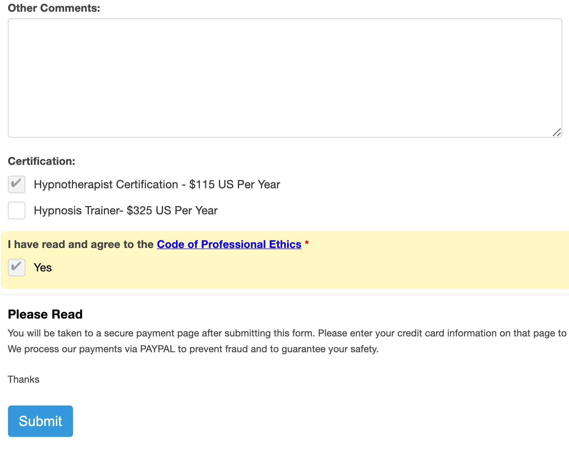 その下の、『Please tell us the name of the Hypnosis Trainer who signed your certificate』(日本語訳:資格発行を認定したトレーナーの名前を記載してください。)