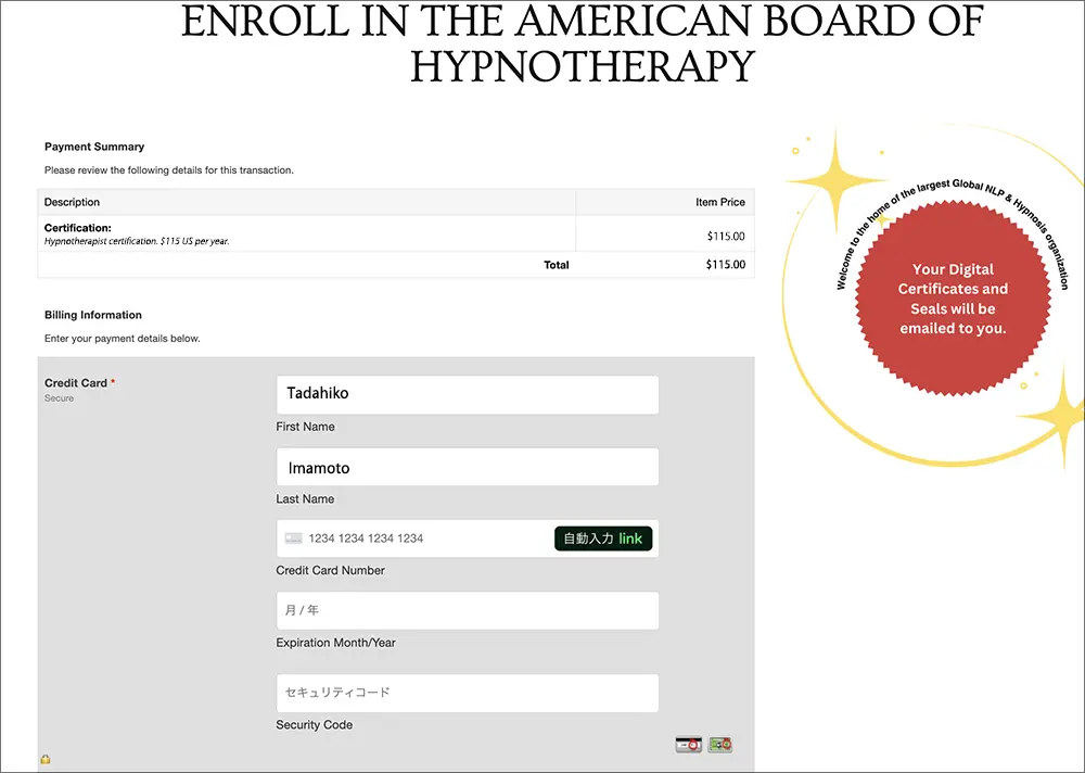 Hypnothrapist Certification ー $115 US Per Year (ヒプノセラピスト資格 $115 US 年更新)