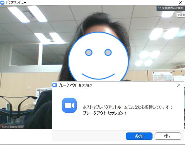 下記の写真のように、講師から「ホストはブレークアウトルームにあなたを招待しています」という表示が出れば、「参加」ボタンをクリックして、ルームの中に入ってください。